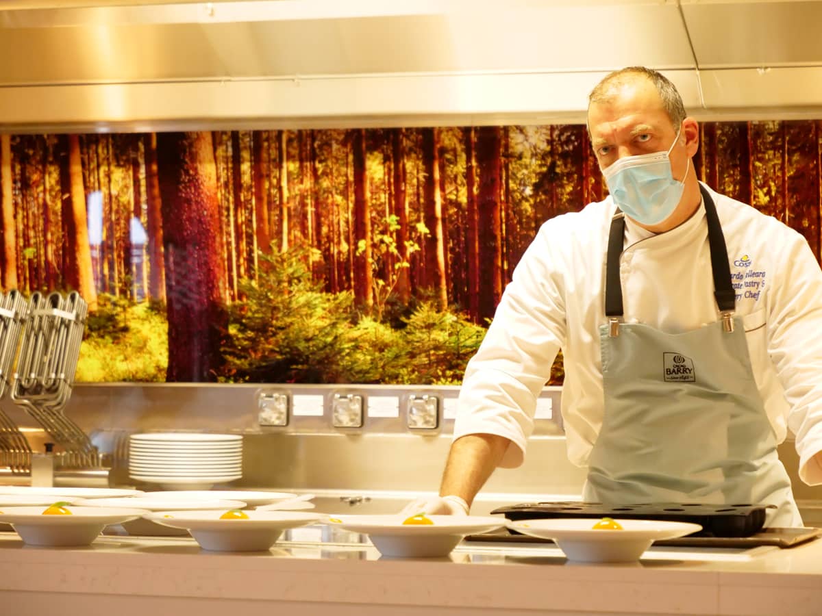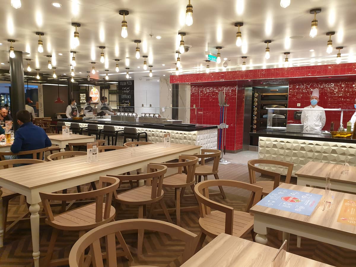For guests staying in Suites, all meals are served in the Ristorante Panorama, which is located at the bow of the ship with an elegant environment and exceptional service. Part of the menu is the same as in the main restaurants, but with some specialties only served in this dedicated restaurant. It is also possible for any guest in other room levels to access it for a fee or even purchase a package that includes all meals here during the cruise. Ristorante Bellavista, located next to Ristorante Panorama is reserved for guests with the highest Club Costa level, but is currently closed due to the limited number of passengers on board.